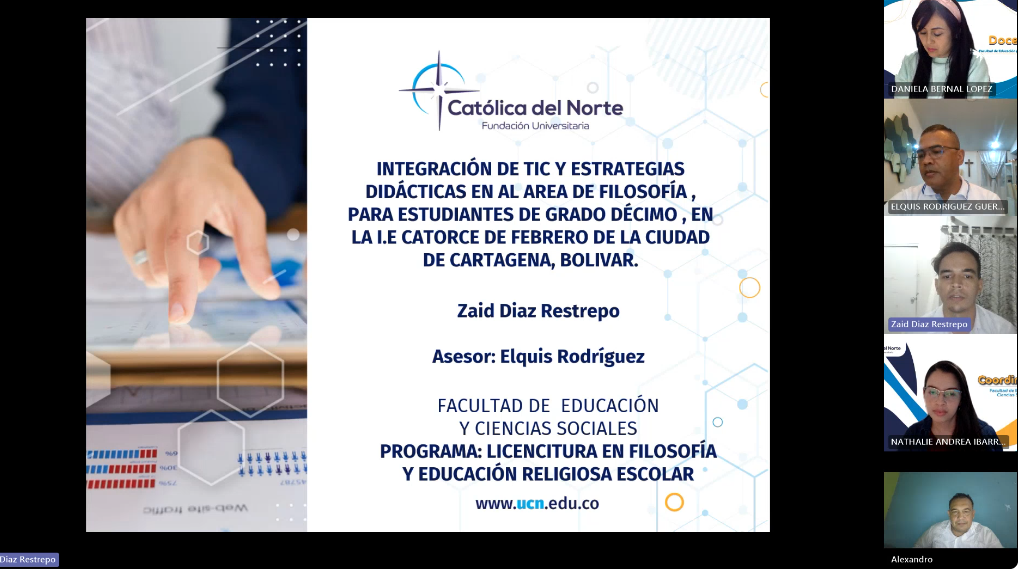 “Simposio de socialización de trabajos de grado” El jueves 21 de noviembre se llevó a cabo el simposio de socialización de trabajos de grado de nuestros últimos estudiantes de la Licenciatura en Filosofía y educación religiosa; dos futuros egresados de este programa en cierre, contaron acerca de su proceso logrado durante sus prácticas profesionales a lo largo de un año y los elementos que conforman su trabajo de investigación y sistematización de las prácticas, asesorados por el maestro Elquis Rodríguez Guerra. |