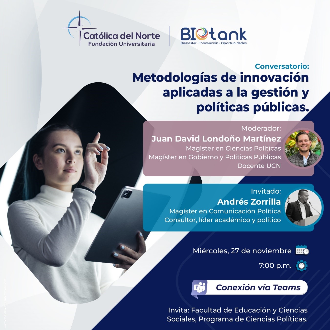 “Conversatorio: Metodologías de innovación aplicadas a la gestión y políticas públicas” El 27 de noviembre se realizó el evento de cierre del semestre a cargo del programa Ciencias Políticas, donde el docente Juan David Londoño Martinez organizó un conversatorio con un invitado destacado en el gremio de la política, con quienes reflexionó entorno a las metodologías de innovación aplicadas a la gestión de políticas públicas. |