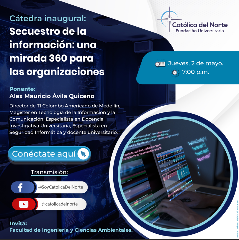 CÁTEDRA INAUGURAL AL SEGUNDO BLOQUE ACADÉMICOPara dar apertura al segundo bloque académico de este semestre, la Facultad ofreció para todos los estudiantes la ponencia: «Secuestro de la información: una mirada 360 desde las organizaciones», una charla que aborda cómo las empresas pueden prevenir, detectar y mitigar los efectos del ransomware y otras amenazas de ciberseguridad, analizando tanto los aspectos técnicos como las estrategias de gestión y respuesta. Esta cátedra se llevó a acabo el 2 de mayo y estuvo orientada por Alex Mauricio Ávila Quiceno, Director de TI del Colombo Americano de Medellin, Magister en Tecnologías de la Información y la Comunicación, especialista en Docencia Investigativa Universitaria, Especialista en Seguridad Informática y Docente universitario. | ![]() |