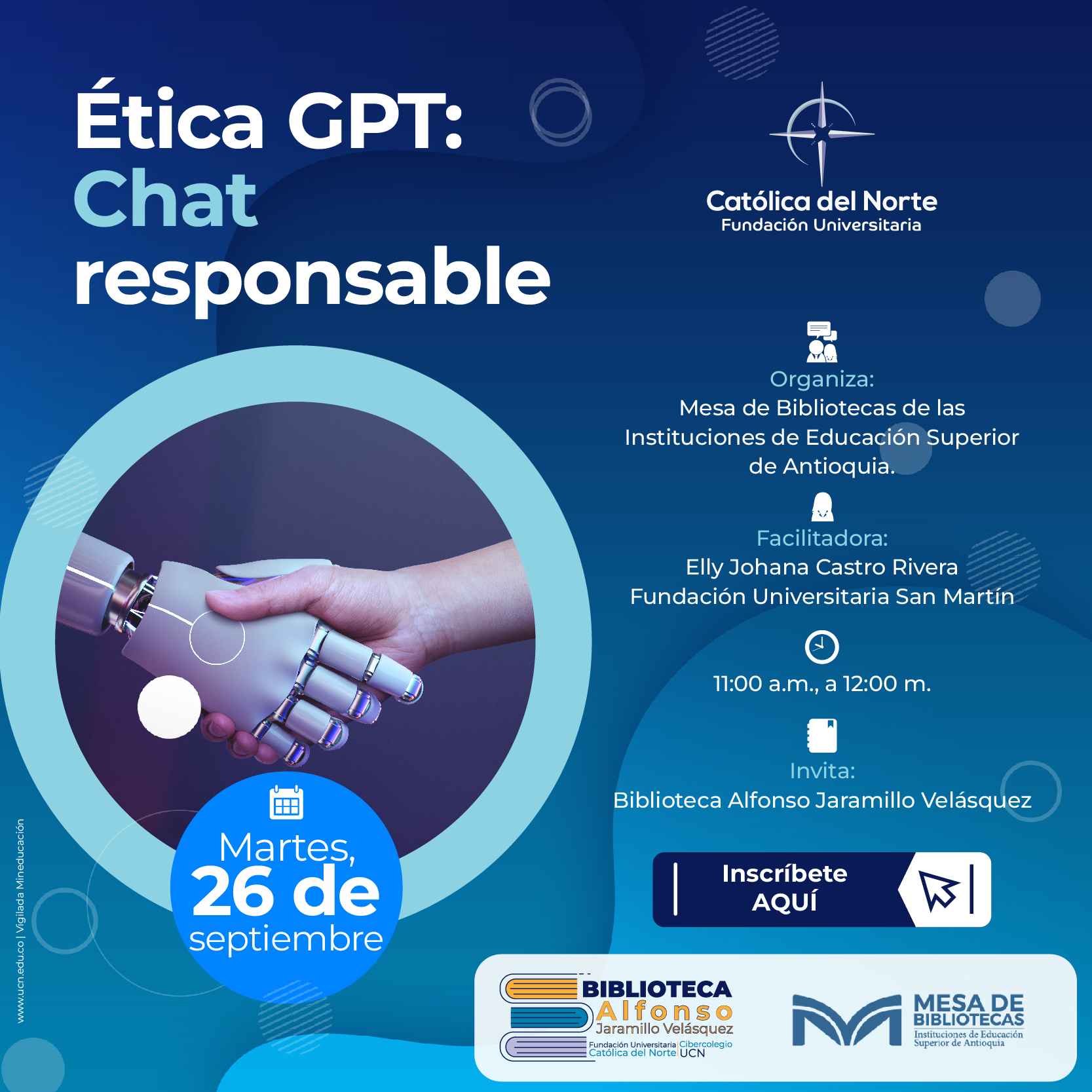 Desde la Mesa de Bibliotecas de las Instituciones de Educación Superior de Antioquia a la cual nuestra biblioteca hace parte, les extendemos esta invitación a participar de la charla de Ética GPT. ¡Seamos responsables y éticos en el uso de las inteligencias artificiales!!