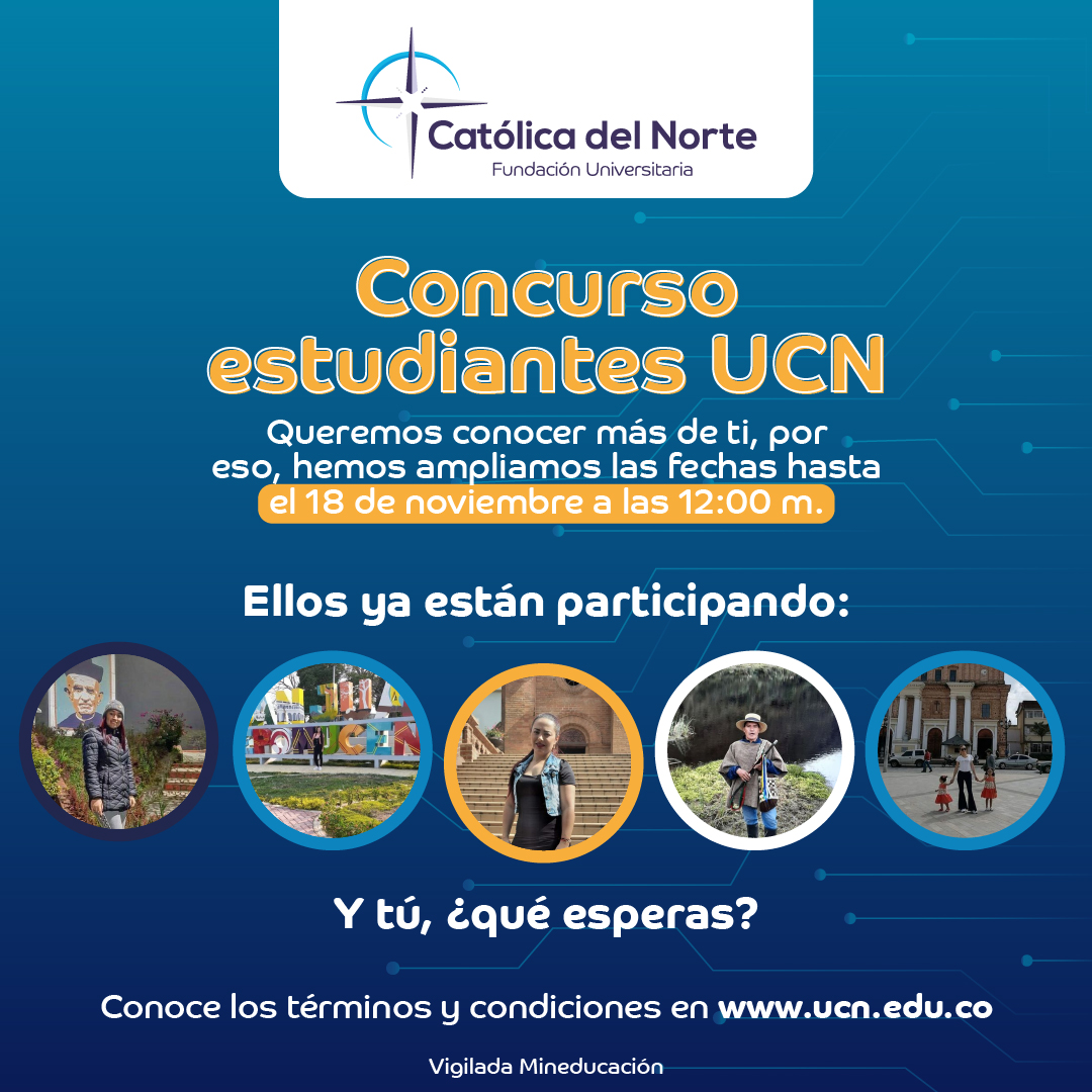 - Para participar el concursante deberá subir su foto a sus redes sociales (FB o IG) mostrando un lugar representativo del municipio o región donde se encuentra, indicando su nombre y el nombre del programa académico al que hace parte, municipio donde se encuentra y contándonos que es lo mejor de estudiar virtual, etiquetando la cuenta @soycatolicadelnorte y utiliza los hashtag #EstudianteUCN y #SoyUCN.