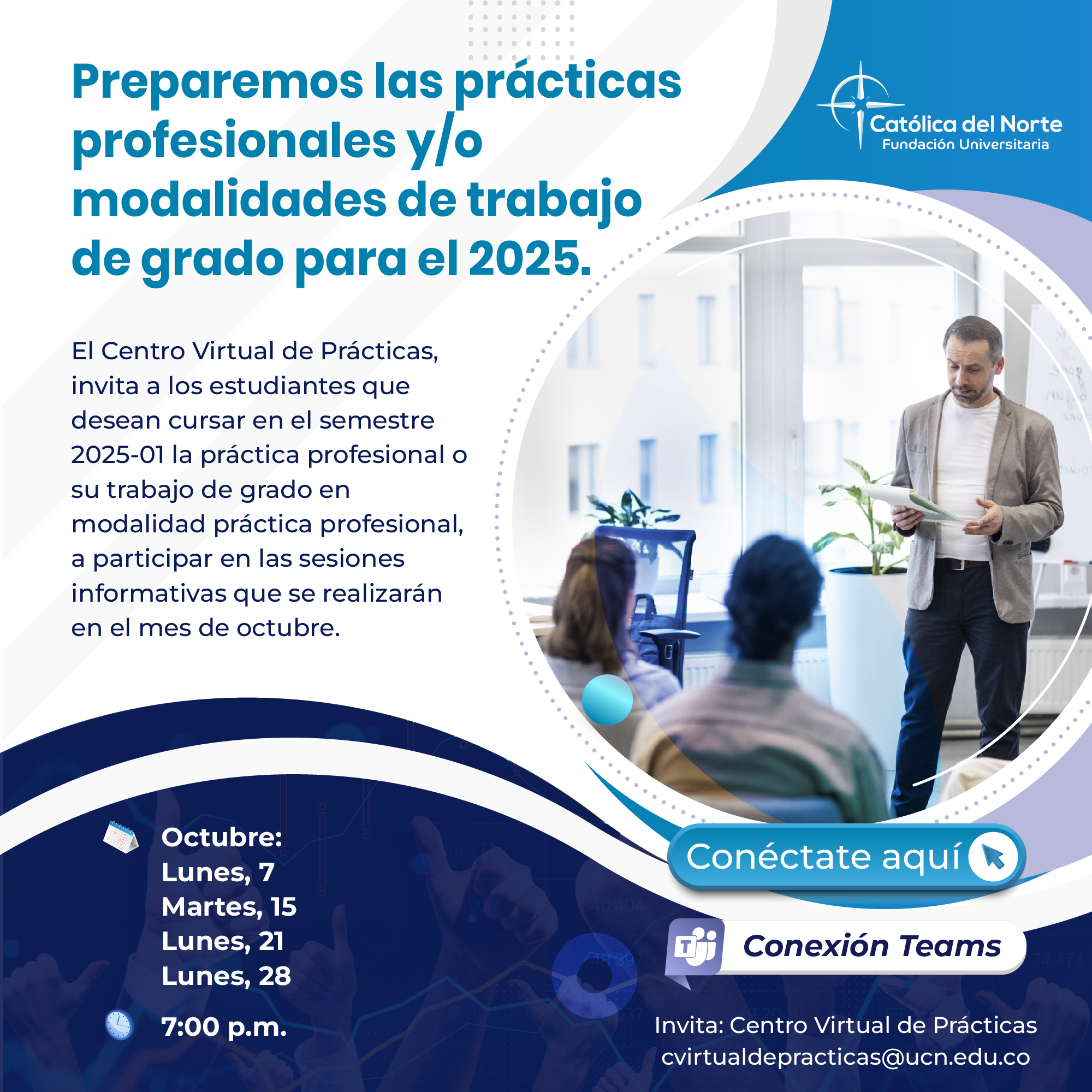 El Centro Virtual de Prácticas de la Fundación Universitaria Católica del Norte, realizará los días 7, 15, 21 y 28 de octubre, a las 7 de la noche (hora Colombia), espacios de diálogo con estudiantes que deseen orientación referente al proceso de práctica profesional (como curso y/o modalidad de práctica) para el año 2025-semestre 01.