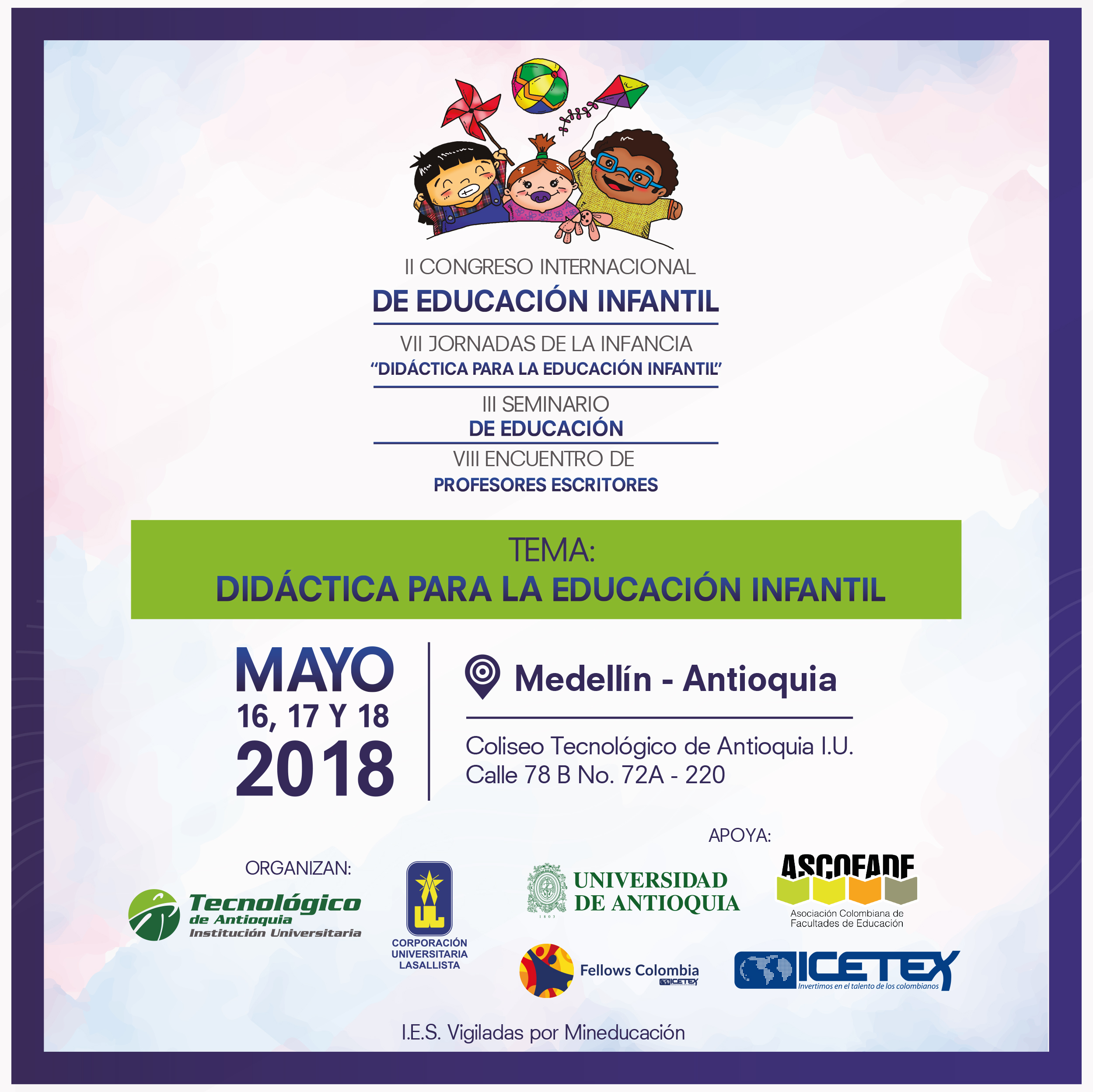 Con el objetivo de dialogar y reflexionar sobre enfoques didácticos en el contexto de la educación infantil mediante el intercambio académico de experiencias investigativas y educativas desarrolladas en el ámbito nacional e internacional se reunirán en el Coliseo del Tecnológico de Antioquia el II Congreso Internacional de Educación Infantil, las VII Jornadas de la Infancia «Didáctica para la educación infantil», el II Seminario de Educación y el VIII Encuentro de Profesores Escritores.