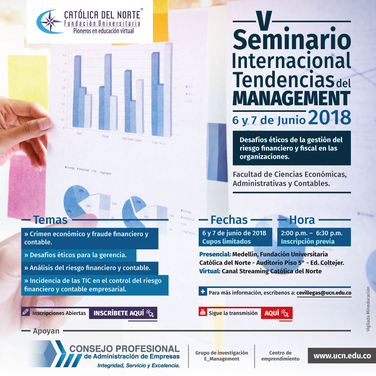 La Facultad de Ciencias Económicas Administrativas y Contables de la Fundación Universitaria Católica del Norte, y el grupo de investigación E-management, interesados en aportar a la actualización y fortalecimiento académico y profesional de nuestra comunidad, han programado el V Seminario Tendencias del Management, para los días miércoles 6 y jueves 7 de junio, en las horas de la tarde. Las modalidades de participación son virtual y presencial (Edificio Coltejer piso 5), para lo cual se requerirá registro respectivo al inicio y cierre de cada jornada del evento, con el fin de otorgar la certificación respectiva.
