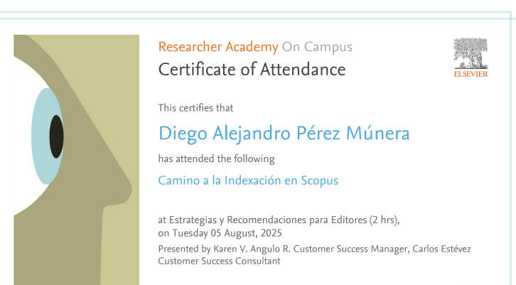 Participación en seminario web “Camino a la Indexación en Scopus”Diego Alejandro Pérez Múnera, asistente editorial/corrector de estilo, participó, en nombre de la Revista Virtual Universidad Católica del Norte, en el Seminario Web “Camino a la Indexación en Scopus: Estrategias y Recomendaciones para Editores”, convocado por Elsevier, y efectuado el 5 de agosto. En el encuentro se abordaron los “criterios de selección, el proceso de postulación y las mejores prácticas para lograr la indexación en Scopus. Además, se compartieron experiencias de revistas ya indexadas, con el fin de resolver dudas en un espacio interactivo diseñado especialmente para editores”. Este espacio le permite a la Revista tener insumos para realizar un diagnóstico de sus posibilidades de postulación a Scopus, determinando así fortalezas y aspectos que requieren mejorarse para este cometido |