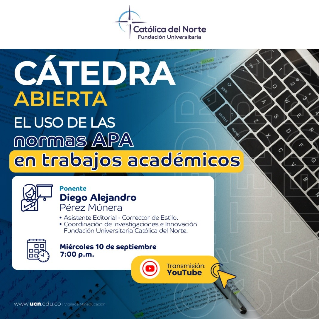 Formación en Normas APACon el fin de ofrecer formación continua a la comunidad académica, interna y externa, se efectuó la Cátedra Abierta: El uso de normas en trabajos académicos. Espacio realizado el 10 de septiembre, con la participación del corrector de estilo de la unidad, Diego Alejandro Pérez Múnera. Está disponible en YouTube, y cuenta con 263 visualizaciones. https://www.youtube.com/watch?v=plz_X7iuFBw&t=7s |