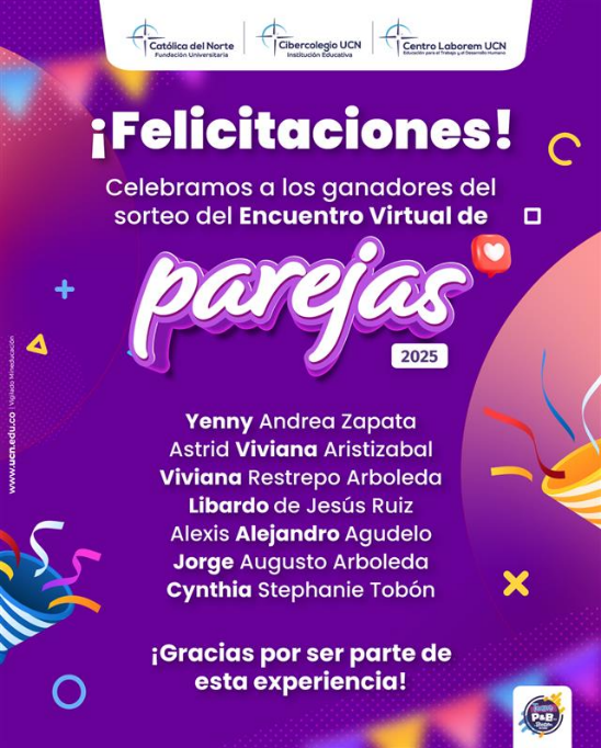 El pasado 28 de agosto, se llevó a cabo el tradicional Encuentro Virtual de Parejas, un espacio que año tras año ha consolidado su lugar en la vida institucional como una oportunidad para reflexionar, compartir y fortalecer los vínculos afectivos. En esta versión 2025 contamos con la valiosa participación de alrededor de 50 parejas, quienes se unieron para dialogar y aprender en torno al tema “Las crisis en la relación de pareja”. La jornada fue orientada por psicólogos de Pastoral y Bienestar UCN y del Cibercolegio, quienes ofrecieron herramientas para comprender y afrontar de manera constructiva los retos propios de la vida en pareja. Además de la riqueza del intercambio, algunos participantes resultaron ganadores de bonos por valor de $100.000, como un reconocimiento especial a su compromiso con este espacio. Queremos resaltar que este encuentro, con varios años de trayectoria, ha contado siempre con una gran acogida por parte de nuestra comunidad. Su propósito central es contribuir al fortalecimiento del vínculo afectivo, la comunicación y la fortaleza emocional en las relaciones de pareja. Obsérvate, Reconócete, Transfórmate. |