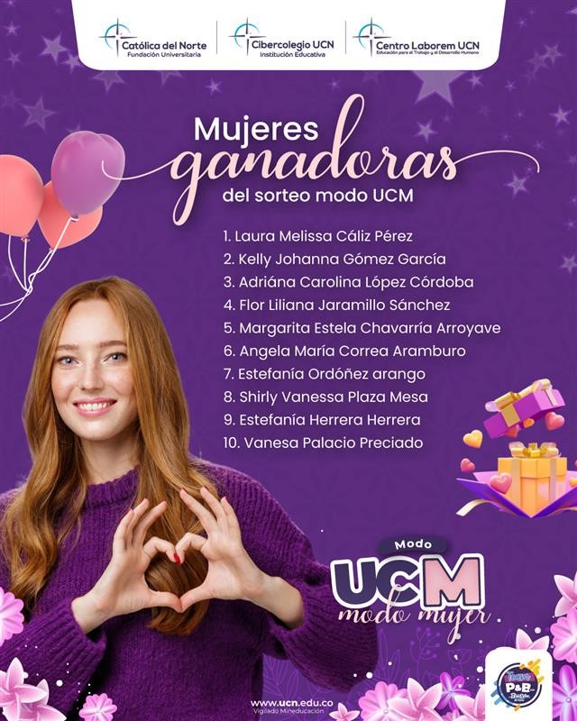 Del 8 al 15 de marzo, todos los entornos educativos de la UCN se vistieron de púrpura como un sincero homenaje a las mujeres de nuestra institución. Este gesto simboliza el reconocimiento a su valiosa contribución, ya que la población femenina supera en número de las estudiantes, graduadas y administrativas. La celebración tuvo como propósito rendir un merecido tributo a las mujeres de la UCN, del Cibercolegio y del Centro Laborem, destacando su impacto en la sociedad y en nuestra comunidad desde los diversos roles que desempeñan. Como parte de esta celebración, se instaló el «Buzón M», un espacio para compartir mensajes inspiradores y la celebración culminó con una emotiva Eucaristía seguida de un homenaje virtual, donde 10 afortunadas ganadoras recibieron un bono por valor de $100.000 cada una. Revive estos momentos especiales a través del siguiente enlace: https://view.genially.com/67c9db479da6a52bd7a403a3 |