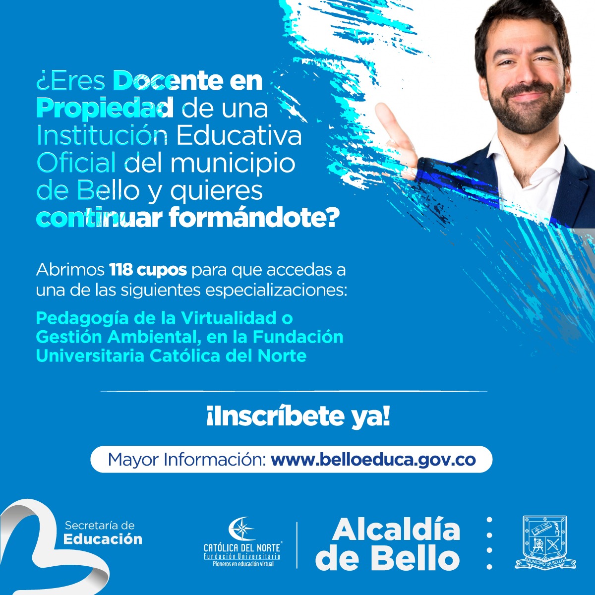 Desde la semana anterior se encuentra abierta la convocatoria para la 2ª cohorte de Especializaciones en Pedagogía de la Virtualidad y Gestión Ambiental para docentes y directivos docentes en propiedad de la Alcaldía de Bello – Antioquia.